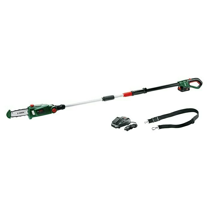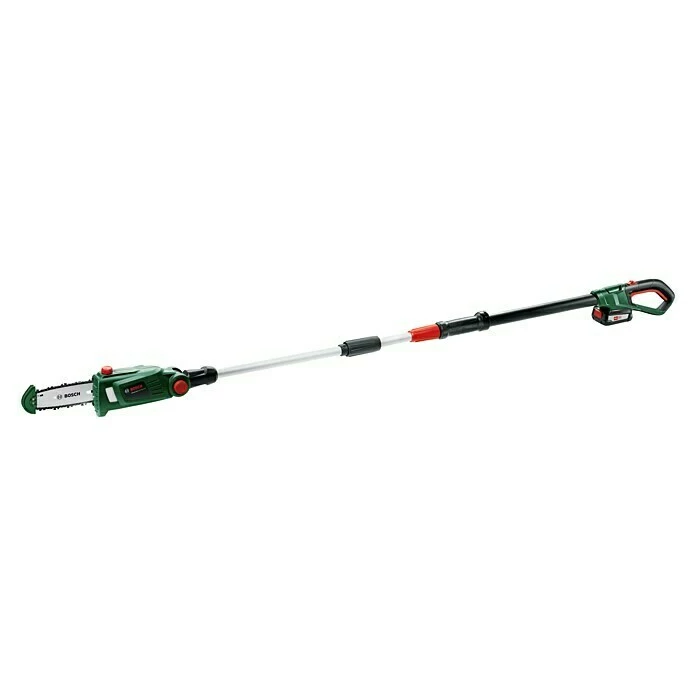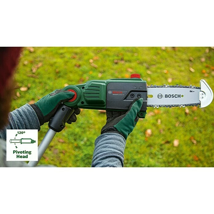 Der Hochentaster UniversalChainPole 18 von Bosch ist ideal zum mühelosen, ergonomischen Auslichten und Entasten von Bäumen und Gehölzen ohne Leitereinsatz. Dank des verstellbaren Teleskopstiels und des um 120° schwenkbaren Gerätekopfs lassen sich schwer zugängliche Stellen einfach erreichen. Die leistungsstarke Kettensäge sorgt für saubere Schnitte bei einem kontinuierlichen Arbeitsfortschritt. Dank des speziellen Schneideanschlags kann auch an der Astunterseite geschnitten werden. Durch die automatische Kettenschmierung wird dem Austrocknen des Schneidewerks vorgebeugt. Angetrieben wird das Gerät durch einen 18 V Akku (im Lieferumfang enthalten), der dank der Li-Ionen-Technologie eine lange Lebensdauer und keinen Memory-Effekt aufweist. Außerdem ist der Akku mit dem Syneon Chip versehen, der die Kraftabgabe an die Anwendung entsprechend anpasst.