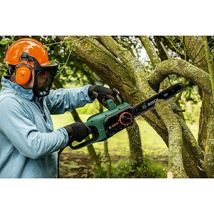 Die handliche und einfach zu bedienende Elektro-Kettensäge UniversalChain 40 von Bosch verfügt über einen leistungsstarken 1.800 W Motor mit einer Kettengeschwindigkeit von 12 m/s und sorgt damit für schnelle Schnitte. Die Elektro-Kettensäge hat ein Gewicht von 4,3 kg, überzeugt durch ein ergonomisches Design und ist auf optimalen Benutzerkomfort ausgelegt. Das patentierte SDS-System von Bosch ermöglicht ein werkzeugloses und einfaches Spannen und Warten der Kette. Die UniversalChain 40 verfügt über einen seitlich ausgerichteten Ölbehälter, wodurch ein einfaches Nachfüllen des automatisch arbeitenden Kettenschmiersystems ermöglicht wird. Mit einer stabilen Rückschlagbremse zum wirkungsvollen Stoppen der Kette ist für die erforderliche Sicherheit gesorgt. Die Elektro-Kettensäge ist perfekt zum Sägen von Baumstämmen, dicken Ästen und kleinen bis mittelgroßen Bäumen geeignet.